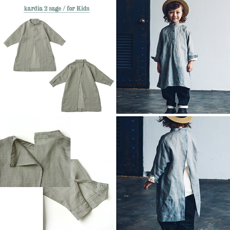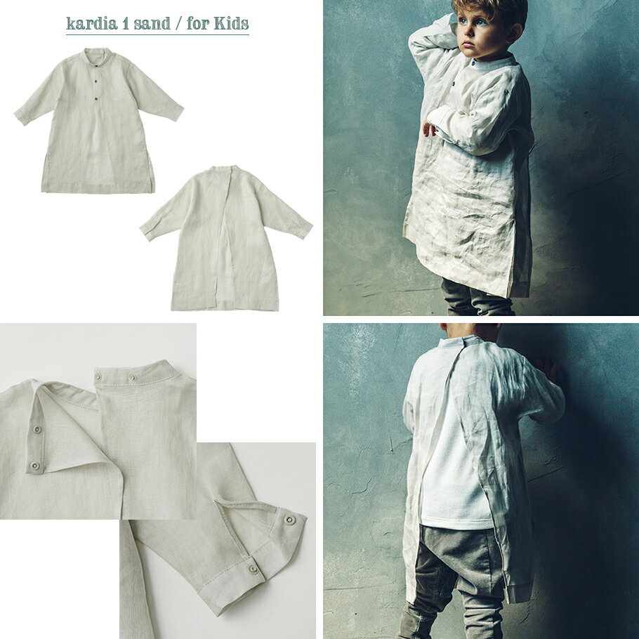 Apron kardiaシリーズ(ベビーサイズ 80-90cm)はこちら 商品名 kardiaシリーズ(キッズサイズ 100-110cm) 素材 麻100% 本体サイズ 着丈:620 mm、肩幅:340 mm、身幅:400 mm、裾幅:490 mm、袖丈:305 mm 推奨年齢 3〜6歳まで 価格 7,500円(税別) ※注意事項をご確認ください! 素材の特性上、お食事エプロンにはお名前刺繍は入れられません。