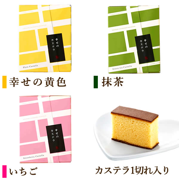 商品詳細 商品名 長崎カステラ個包装6個プチギフトセット 内容 カステラ個包装6個 原材料 [幸せの黄色いカステラ] 鶏卵(国産)、砂糖、小麦粉、水飴、ザラメ糖、蜂蜜、(一部に卵・小麦を含む) [抹茶カステラ] 鶏卵(国産)、砂糖、小麦粉、水飴、ザラメ糖、蜂蜜、抹茶、クロレラ、(一部に卵・小麦を含む) [いちごカステラ] 鶏卵(国産)、砂糖、小麦粉、水飴、ザラメ糖、蜂蜜、ストロベリー果汁、ブドウ糖果糖液糖/着色料(ラック)、酸味料、香料、(一部に卵・小麦を含む) ※当工場では、卵、小麦、乳成分、オレンジ、くるみ、大豆、バナナ、もも、りんごを使用した製品を製造しております。