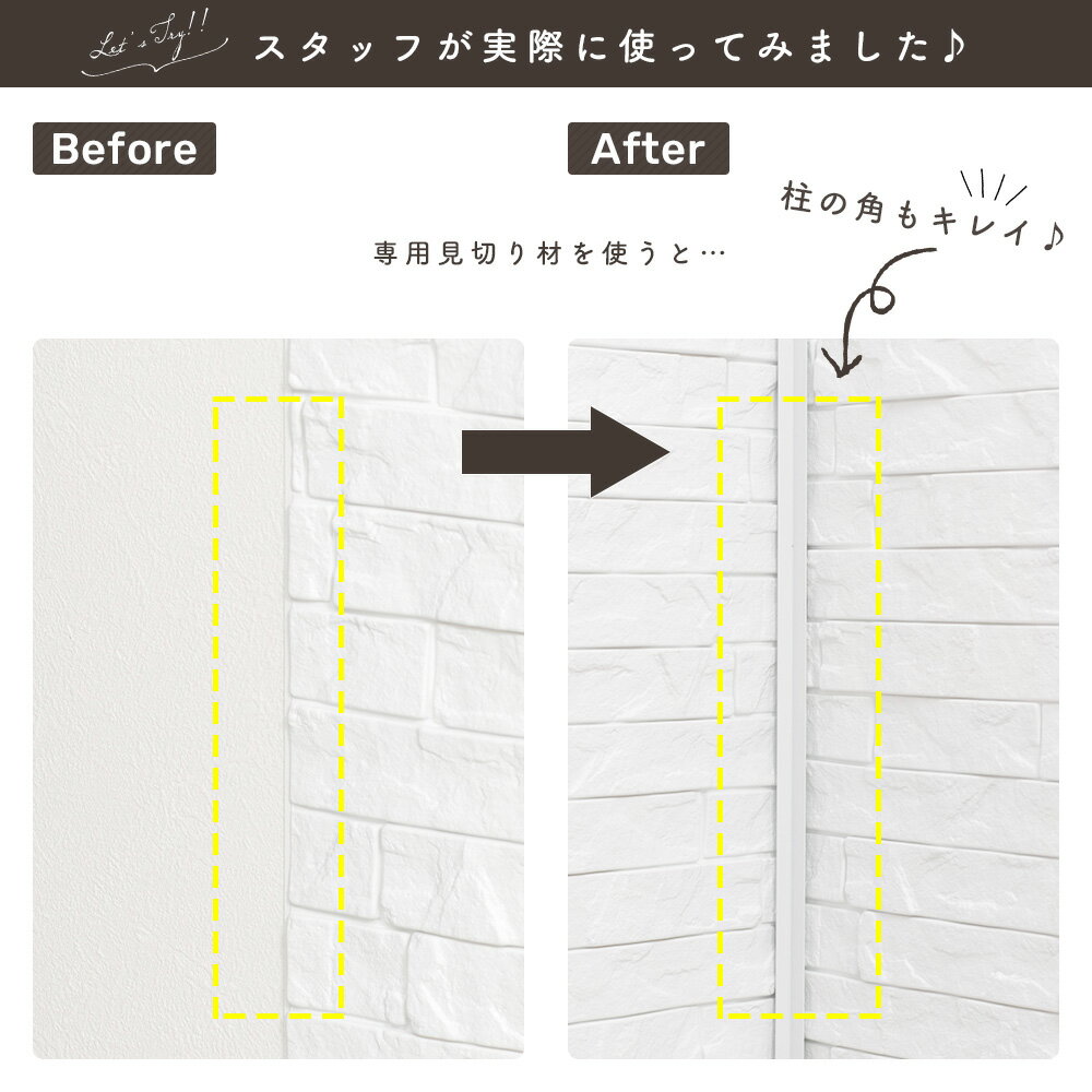 軽量で両面テープやボンドで簡単に施工ができ、水を通さない防水仕様なので、キッチンや洗面所など水まわりの場所で大活躍!壁紙とは違い、傷つきにくく汚れもサッと拭くことができる機能の高さも◎ 角用見切り材です。