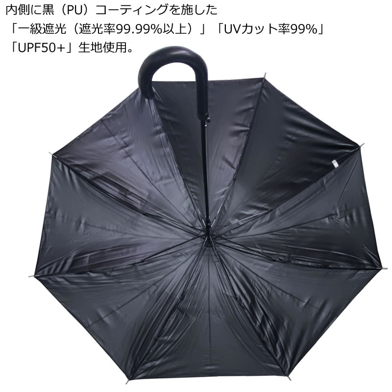 内側に黒(PU)コーティングを施した「一級遮光(遮光率99.99%以上)」「UVカット率99%」「UPF50+」生地使用。